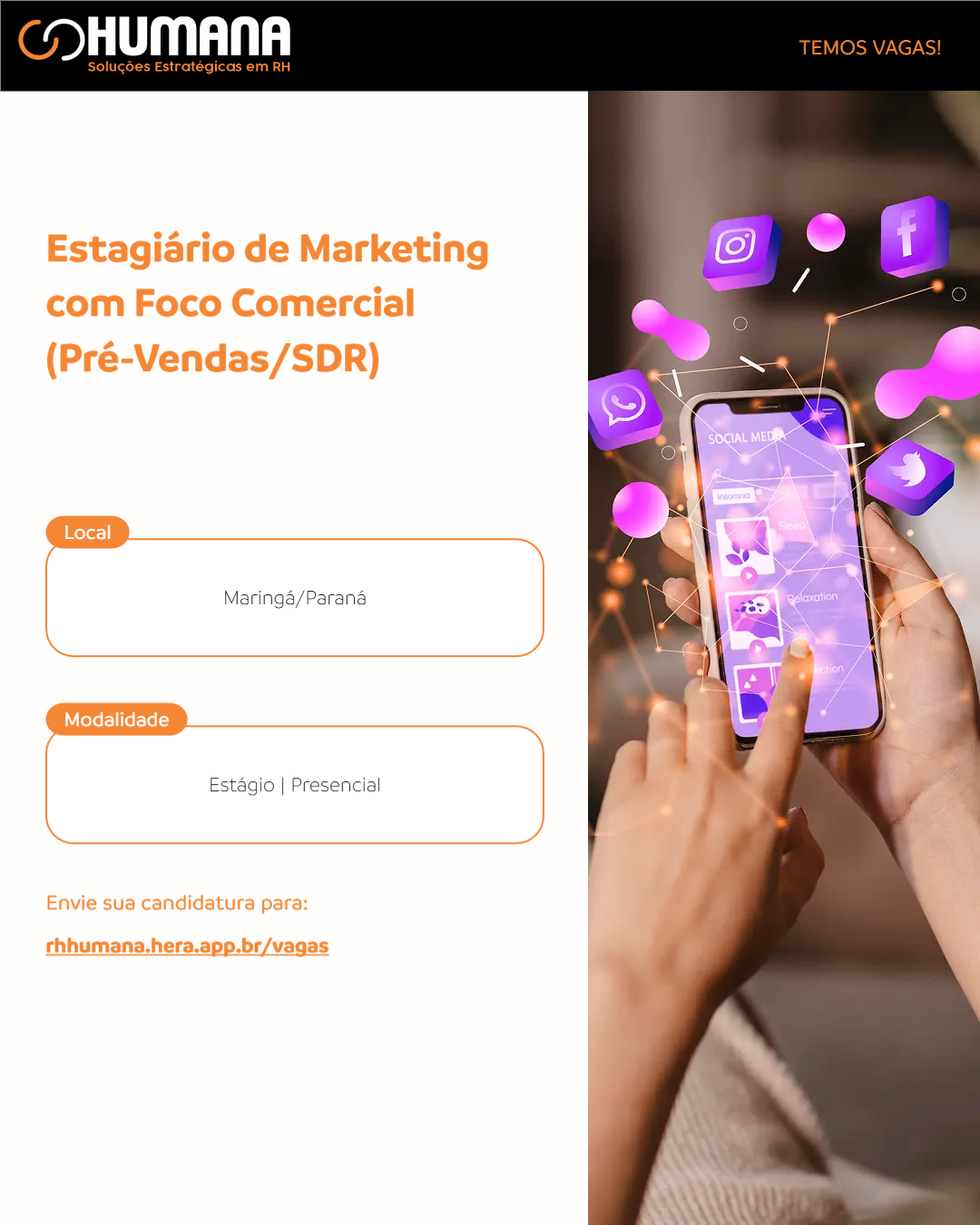 Atuação híbrida entre marketing e vendas, com foco em gerar demanda qualificada, nutrir leads e apoiar o time comercial. A posição exige perfil comunicativo, orientado a metas e com interesse real em desenvolver competências de prospecção, negociação e growth. A jornada é de 4 horas diárias no turno da tarde, com bolsa de R$ 800 + R$ 100 de auxílio-transporte. É uma oportunidade estruturada para quem quer acelerar a carreira e aprender a vender desde o primeiro dia.