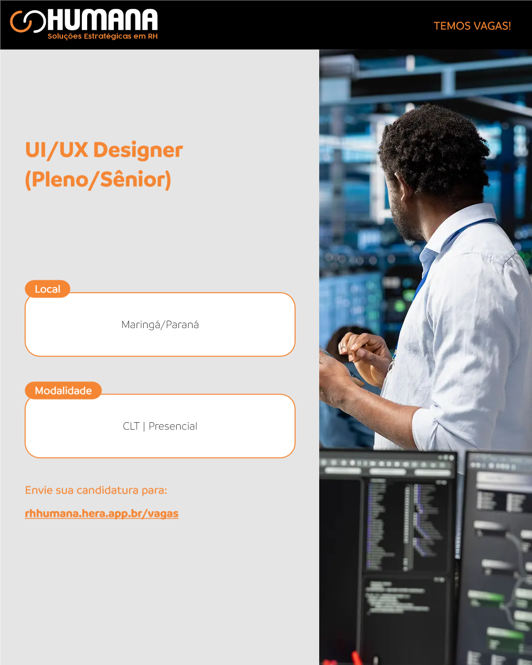 Estamos em busca de um(a) UI/UX Designer apaixonado(a) por criar experiências digitais intuitivas, modernas e escaláveis. Se você gosta de transformar problemas complexos em soluções simples, visuais e funcionais, essa vaga é para você!